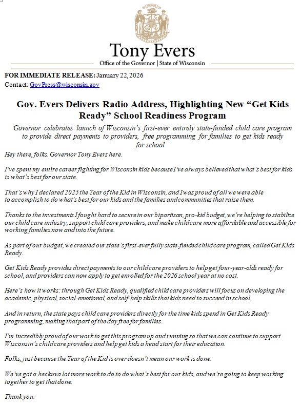 The State of Wisconsin recognizes the need for 4K using other resources that benefit ALL children and